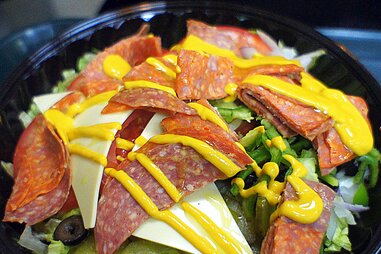 Eat fresh (and low-carb) at Subway by opting for a salad instead of a sub. You can even have most of your favorites—cold cut, Italian BMT, club, tuna—made into salads, which are tossed to order, ensuring everything is evenly dressed. Avoid the meatballs and sweet onion teriyaki, as well as overly sugary dressings, and you have a perfectly low-carb fast food option.